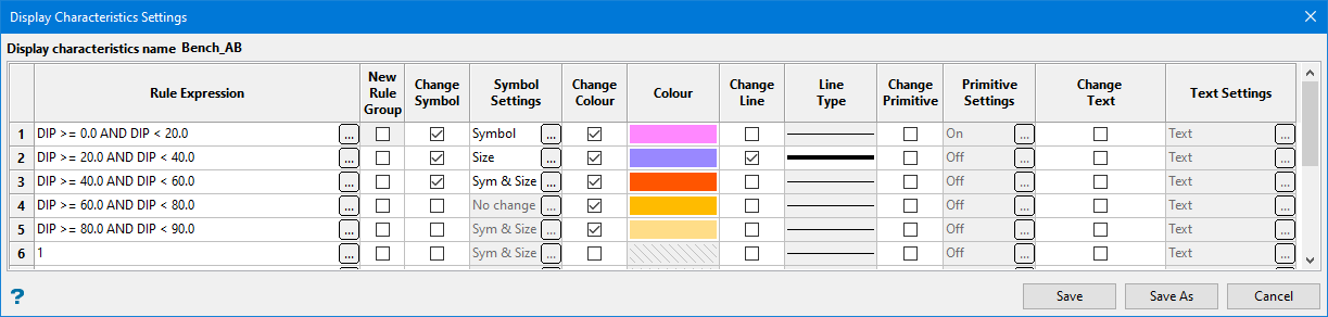 This option allows you to set up the details for Drill and Blast > Edit > Apply Display Characteristics.