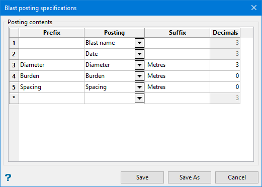 Use the Save As button if you want to save the settings under a different specification name. Once the Save As button has been selected, the Save As panel is displayed. Simply enter the specification name before before selecting the OK button. The resulting specifications will be stored within your Drill and Blast specification file (