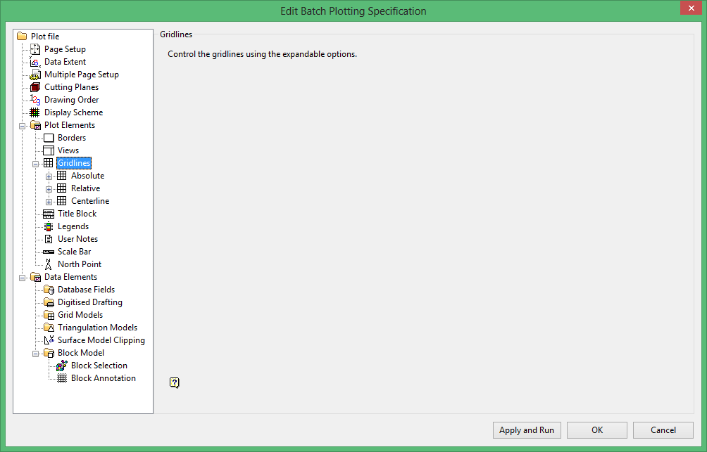 The Absolute, Relative and Centreline subsections allow you to specify the graphical attributes of the gridlines and the spacing between gridlines.