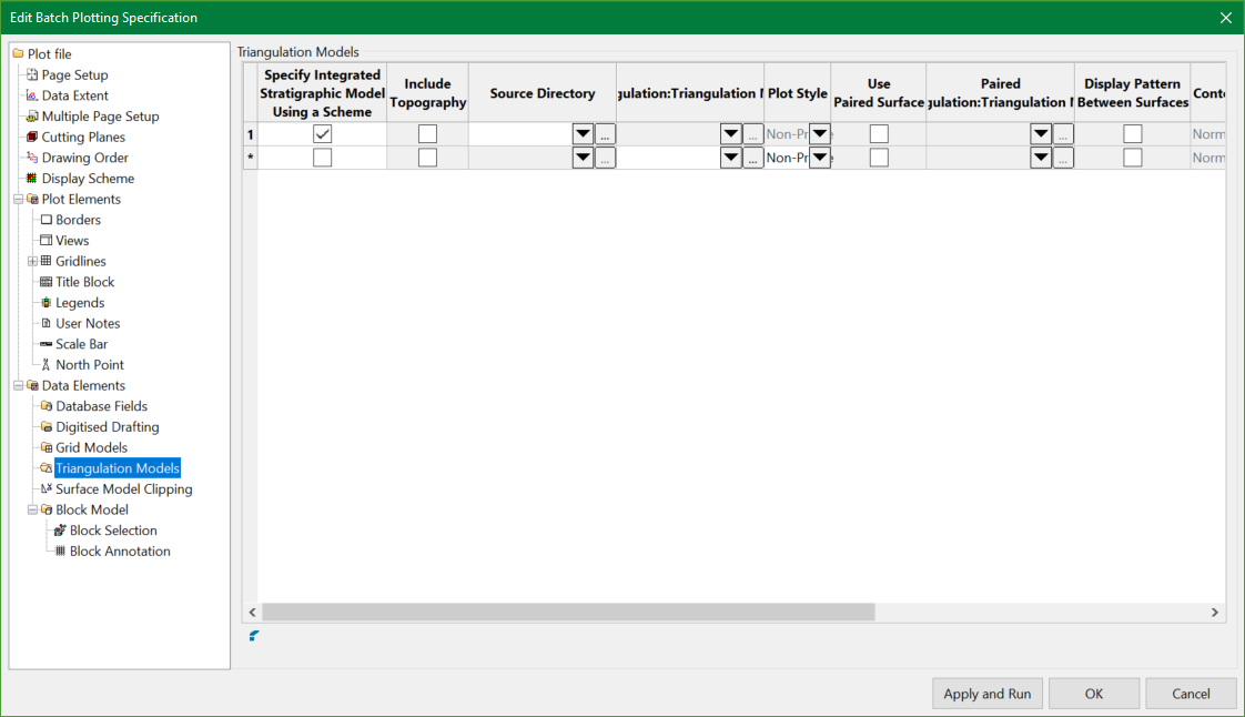 Select this check box to specify a strata scheme as a method of selecting triangulations to be included in the plot. Cells in columns that are no longer applicable, such as Triangulation Model, will be shadowed once you click in a different column.