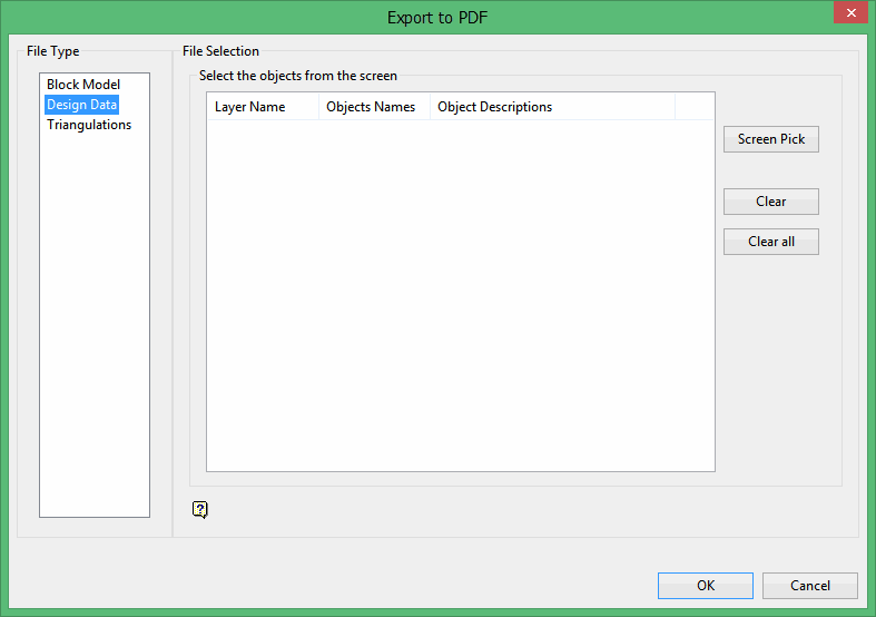 Use the Export Data to PDF option to export block models, design data, and triangulations to a three dimensional PDF file. Once exported, the resulting file can then be viewed with any application that supports PDF viewing, such as Adobe Acrobat. Additionally, using a VRML plug-in, you can insert the file into a variety of applications such as Microsoft Word or PowerPoint, or into a website.