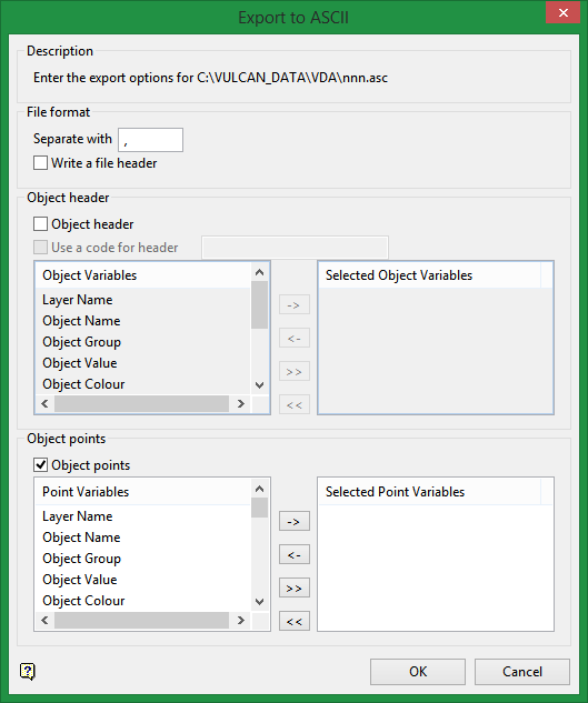 Select this check box to include a file header in the resulting export file. The header will list the attributes chosen through the Object header and Object points sections.