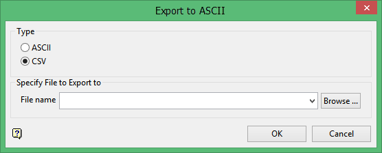 Select a file type for the export. Select ASCII to export the design objects into a formatted ASCII file. Select CSV to export the design objects into a character separated CSV file.