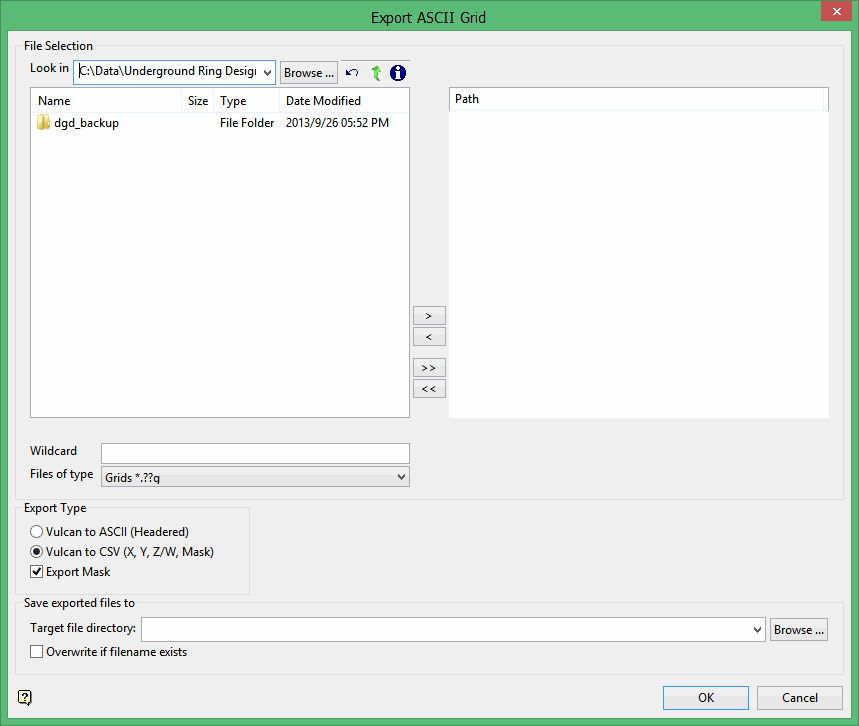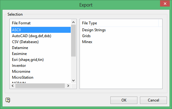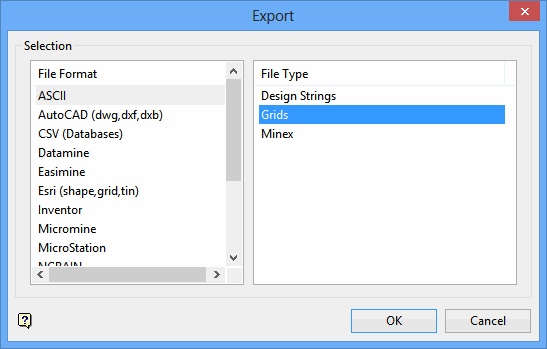 Select Vulcan to ASCII (Headered) or Vulcan to CSV (X, Y, Z/W, Mask) to specify the file type into which you want to export the grid information.