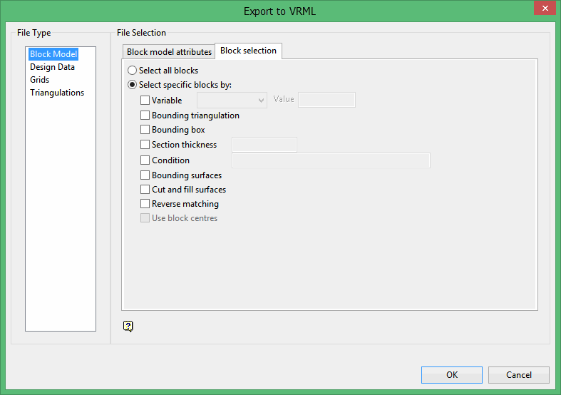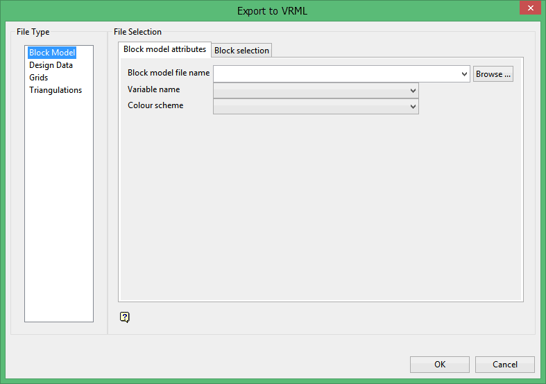 Use the Export Data to VRML option to export block models, design data, grids, and triangulations to a .wrz (comclicked) or.wrl (uncomclicked) file. Once exported, the resulting file can then be viewed with any VRML viewer, for example the Cortona3D Viewer. Additionally, using a VRML plug-in you can insert the file into a variety of applications such as Microsoft Word or PowerPoint.