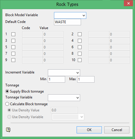 Select this option if you will be supplying the tonnage for the block. You will also need to enter, or select the tonnage variable from the drop-down listing of variables for the currently nominated block model.