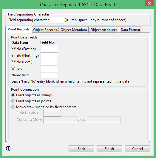 Select this check box If the records contain point data. If the first point is missing from objects or you cannot import single point objects, it may be because this check box has not been selected.