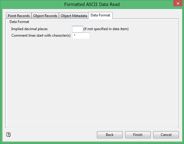Specify the number of implied decimal places and the character(s) at the start of comment lines. Any numbers in the data that don't have decimal places get the implied number. For example: if the implied number of decimal places is 2, the number 100 becomes 1.00. Numbers in the data that do have decimal places are not changed.