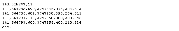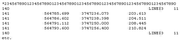 If you define a feature field, and the field already exists in the features file, then the object will be created with the same colour, line type, and pattern fill as the feature. It will also take the group name and object description from the feature, unless you have defined a field in the ASCII data for the group and description. In the examples above, the object name starts in column 60 and can be a maximum of forty alphanumeric characters in length. If a features file has the group forced on, a value has been specified or a field for the group has not been chosen, then the group from the feature file will be used rather than the default.