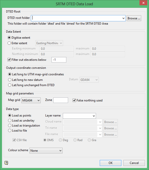Use this option to import data from a Digital Terrain Elevation Data (DTED) file. You can use Vulcan to import the information from a DTED file, including latitude, latitude, and elevation point data. You can also convert the data to a different coordinate system and display or transfer the data to a file.