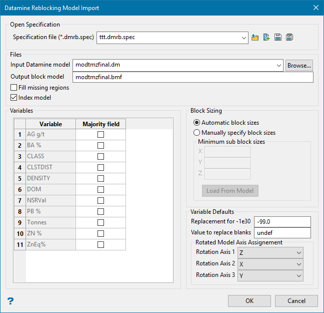Datamine block models often have totally variable sub block sizes in one or more directions. When importing into Vulcan this may cause problems if suitable minimum sizes (resolutions) cannot be found to which to round the Datamine blocks. You should therefore try to make sure that most blocks in the Datamine model are multiples of the minimum block sizes in Vulcan. You can use a Datamine process that will round all block sizes to a resolution prior to importing into Vulcan.
