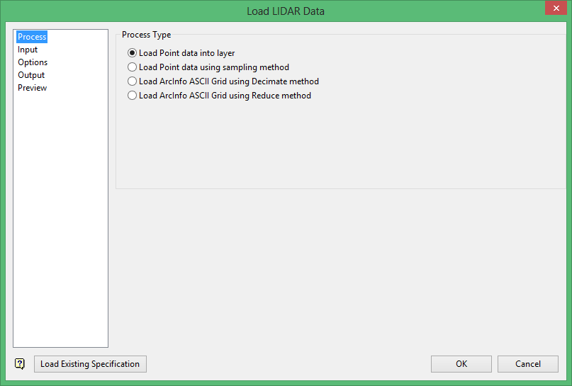 The Load Existing Specification option requires a saved LIDAR specification file that was created when the import functionality was used previously.