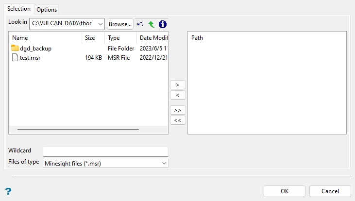 Select the MineSight files (.msr) that you want to import from the current working directory. Alternatively, click Browse... to select files from another location. Use the