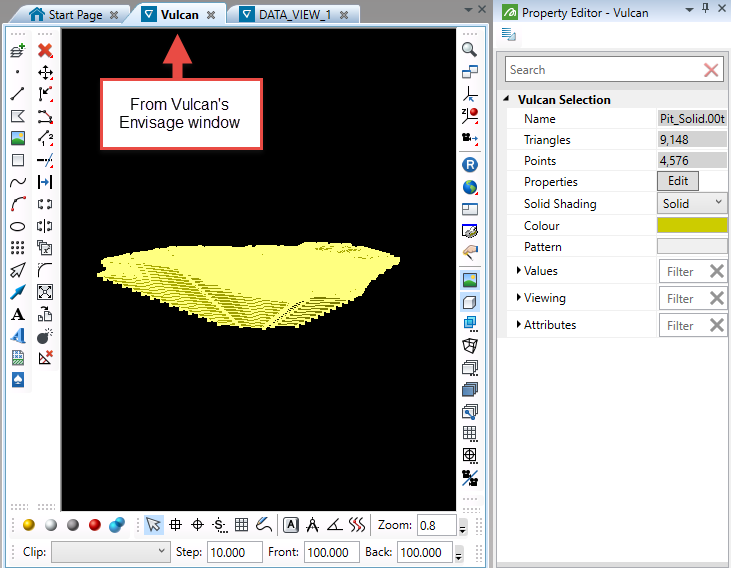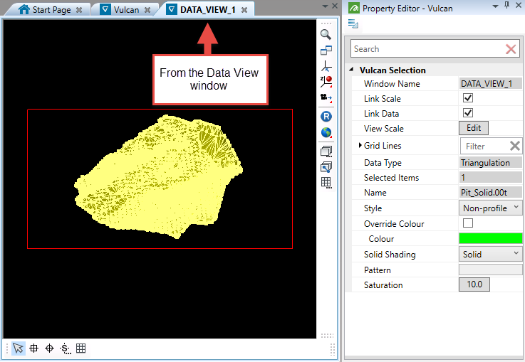 Note: Â The options available in the Property Editor change depending on if you are highlighting an object in Vulcan's Envisage screen or in Plot Builder's Data View screen. This is true even though you may be selecting the same object.