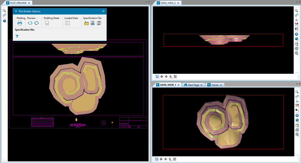 Load the data by dragging the layer or triangulation to a preview window, which will send it to all the views. The orientation of each panel can be adjusted separately. In Figure 1 above, the pit layers were loaded into Data View 1 in the lower right. The same layers also appeared in Data View 2, which was then orientated to a side-view.