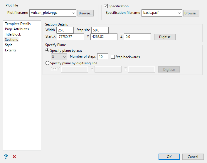 Define the Section details to configure the section Width, Step size, and the Start X, Y, and Z point for the sections. The step size value refers to the distance between each section. You can also select Digitise to pick a start point on screen instead of entering the X, Y, and Z location.