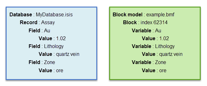 Python treats block models in a way similar to working with a database. Each block can be thought of as representing a record, and the variables found within that block represent a field within that record.