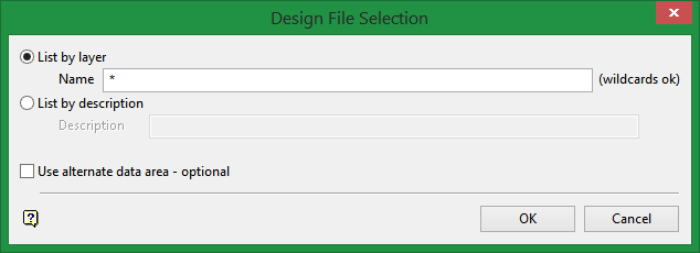 Check this box to list layers from a nominated data area (usually different from your current working directory, although you can select the current working directory). The alternate data area can be used in conjunction with the : (colon) entered in the Layer name field. The colon indicates that another design file is required than the open one, checking this option indicates that another data area is required. The panel where the data area can be specified, displays upon completion of the current panel. Refer to List Files option for information on the Select Data Area panel.