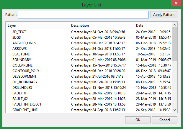 Select this option to list layers by description. All or part of the description needs to be entered. Any layer that has the entered characters in their description will then be listed. Colons, underscores or wildcards cannot be used when listing by description.