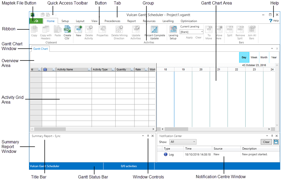 The Gantt Chart window is the visual display of the scheduling information for the project. Â It includes an Activity Grid area with activity and setting information, a Gantt Chart area which serves as a visual chart with timeline and precedence information, and an Overview area which includes a visual overview of all activity information over the entire timeline of the project.