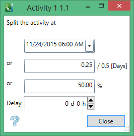 You can split the activity in one of three ways: by date, number of days, or percentage. When you modify one number or date on the panel, the others will adjust according to you value you entered.