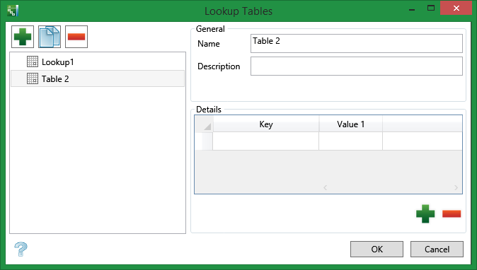 Click the green + button at the bottom of the Lookup Tables panel to add new Value columns to the Details grid.