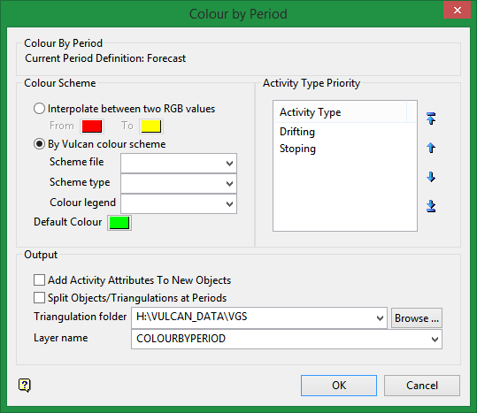Colour by Period colours according to a Period legend setup in Analyse > Legend > Legend Editor. The STRATA section is useful for defining a single period instead of FROM and TO. This option generates copies of the scheduled data in the user defined layer and triangulation subfolder.