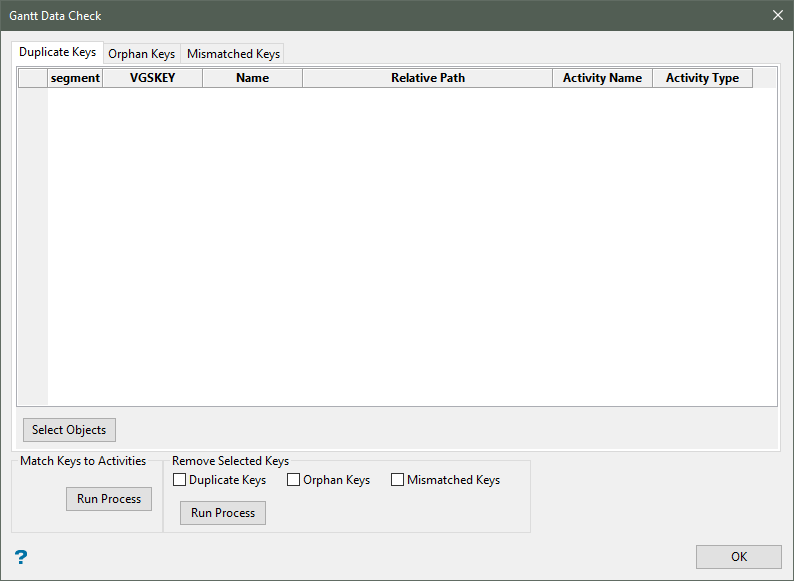 Select from Duplicate Keys, Orphan Keys, and / or Mismatched Key to flag any selected objects listed for removal. Next, click the Run Process button to remove the keys.