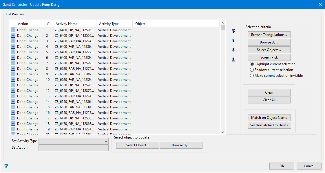 This function will allow you to update activities based on a new or modified design, while maintaining all schedule constraints, precedences, manual attribute values, and resource allocations.