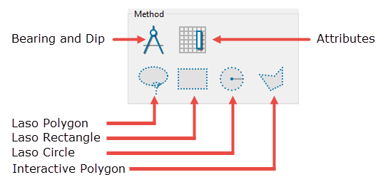 There are six methods of selection. You can select by Bearing and Dip, by Attributes, and four types of laso methods.