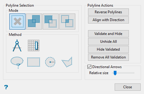 Reverse Polylines Reverse the mining direction of each selected line. Align with Direction Set mining direction by clicking a starting and ending point. Validate and Hide Flag all selected lines as valid, then hide from view. Unhide All Makes all lines visible. Hide Validated Hides all lines flagged as valid. Remove All Validation Removes all validation flags from the selected lines. -