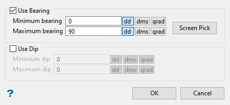 The bearing can be entered into the minimum and maximum boxes by typing the values, or by using the interactive Screen Pick button.