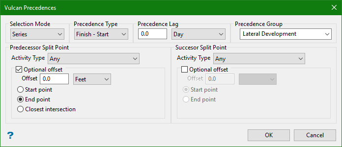 Select Start point, End point, or Closest intersection to indicate the point type of the predecessor. The Closest intersection and Optional offset options allow the Gantt bars to be split and precedences created between parts of activities.