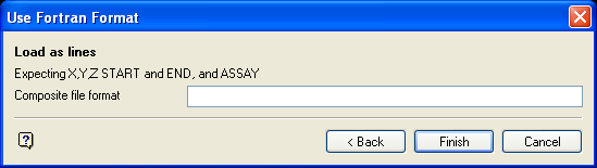 Vulcan expects a minimum of four real numbers. The first three represent the coordinates of the composite mid points, the fourth the W (assay) value. Subsequent real numbers represent any restriction variables. The maximum size of the format is 80 alphanumeric characters. Appendix D of the Vulcan Core documentation lists the fields supported in a Fortran format statement.