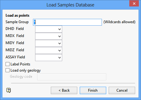 The Load Samples Database panel is then displayed. The options displayed on this panel are dependant upon your choice of loading method, i.e. load the composites as points or as lines.