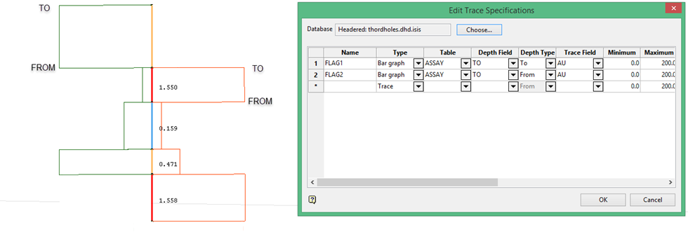 This option is available when Type is set as Bar Graph.  It is not available if Trace has been selected as Type. Depth Type determines whether the bar of the graph will begin at the interval or if it will be offset and begin one interval before  In the diagram below, the top bars of both sides of the drillhole reflect the interval with the assay value of 1.550.