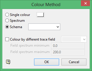 You can either use a single colour for the trace, colour by spectrum or use an existing Pattern colour legend to colour the trace. Check the Colour by different trace field check box to colour according to a different variable from in the table you have chosen. You will need to enter the minimum and maximum values of the trace field to be displayed in the colour spectrum.