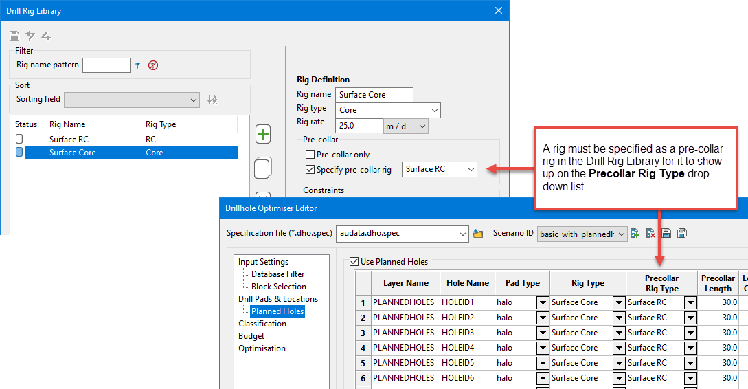 NoteA rig must be specified as a pre-collar rig in the Drill Rig Library before it will be made available for selection in the DHO Editor.