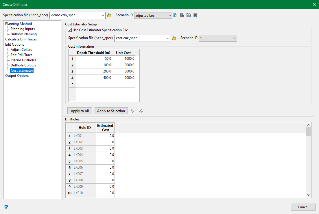 This section allows the estimated cost of drilling each drillhole to be calculated.