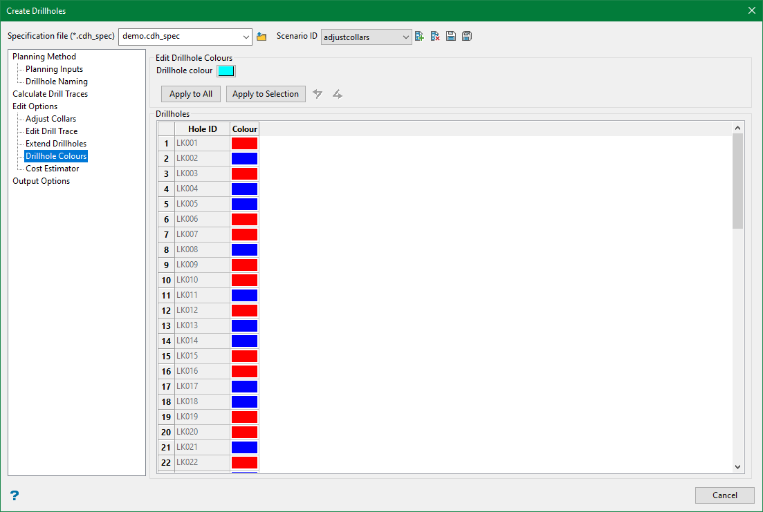 Select the colour of your choice and apply it to all drillholes using the Apply to All button or to those currently selected in the grid by using the Apply to Selection button.