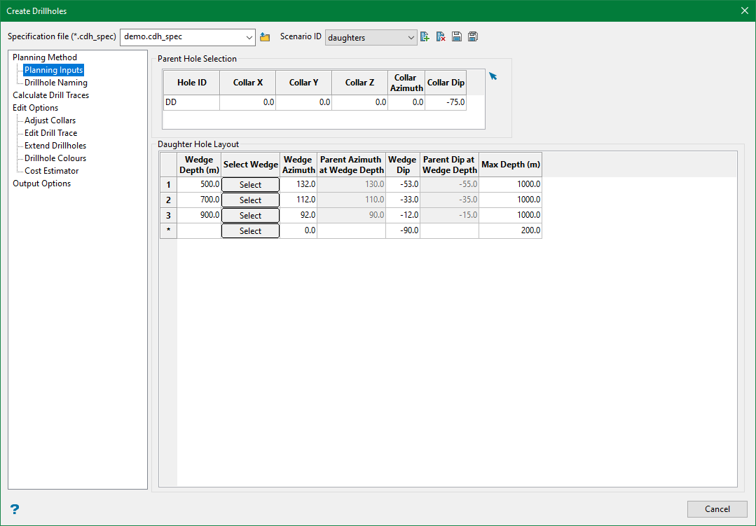 This defines the parameters that are used to create the daughter drillhole(s).