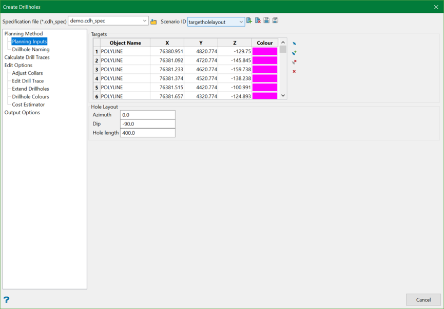 Select the desired target points that will be used to create drillholes. Targets can be chosen either by selecting points interactively, by selecting point and polyline objects on the screen using the Select option, or by digitising a new collar point location using the Digitise option from the controls available on the right.