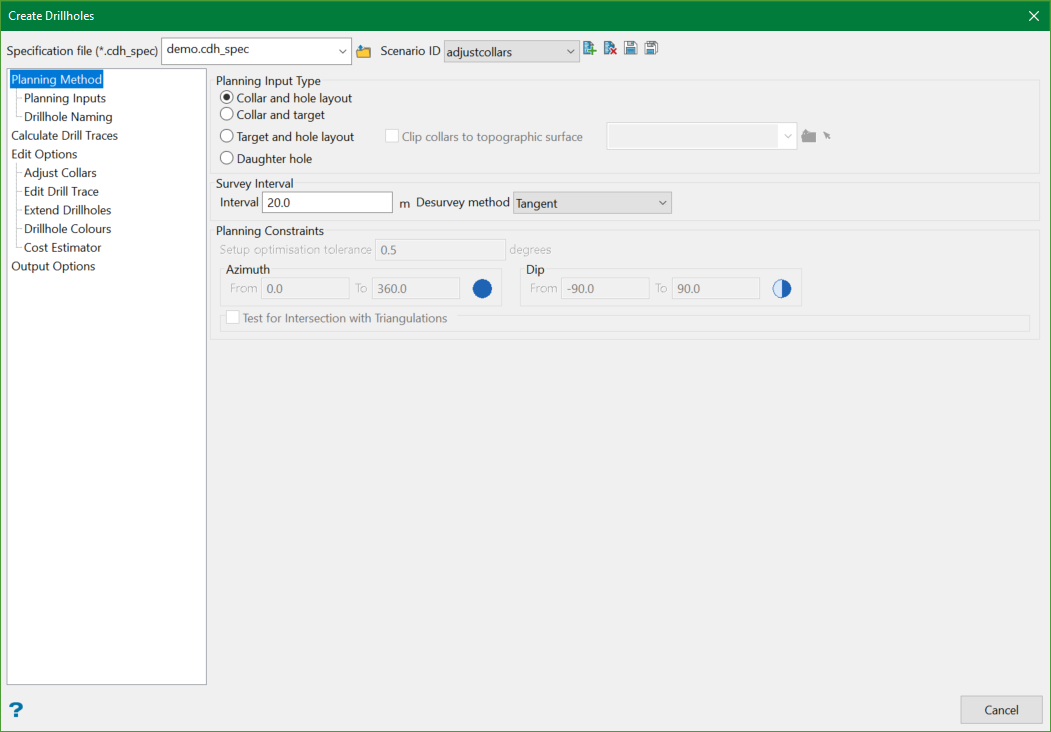 On the Geology menu, point to Drillhole Planning, then click Create Drillholes to display the following panel.