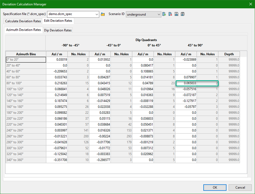 The dip deviation rates are split into quadrants based on 45° increments, totalling 180°. When the dip switches past -90°, it flips the azimuth value by 180°. Example, if a hole of azimuth 90° and dipping at -89.5° were to shift 0.5° past -90°, it becomes -89.5° towards 270°.