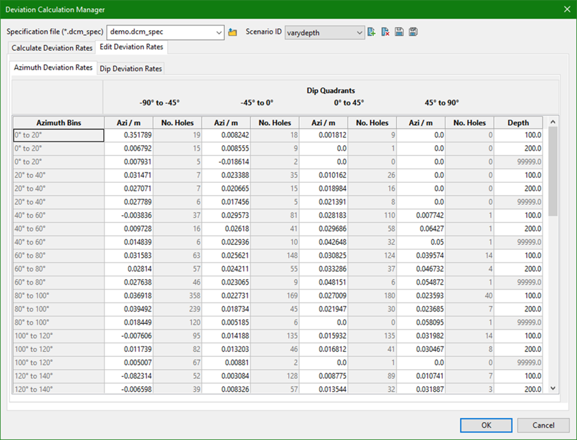 The average deviations are calculated for regions of similar orientation, allowing for different deviation based on drilling direction. It is important to calculate the average deviation rates for dip and azimuth values with respect to different azimuth and dip quadrants. This allows for a more localised control over the dip and azimuth deviation rates calculated and used.