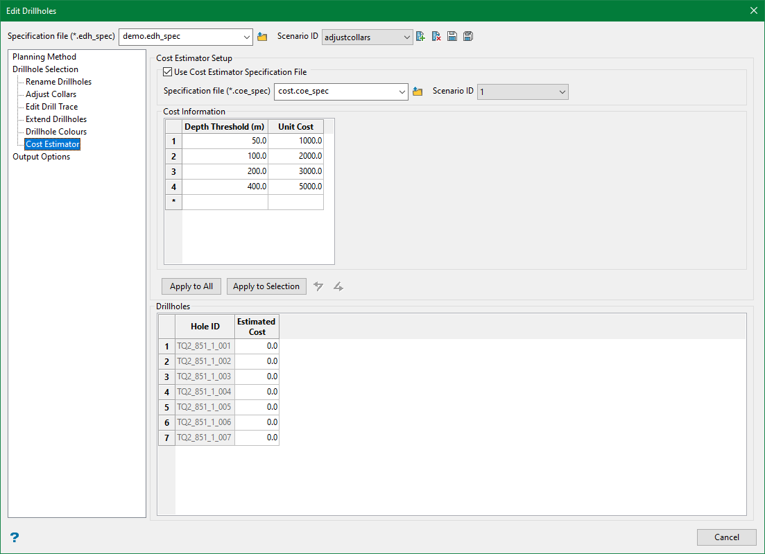 This section allows the estimated cost of drilling each drillhole to be calculated.