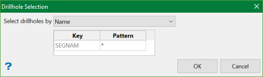 UGDis used for all underground drillholes in the database and only these drillholes were to be loaded, thenUGD*could be input as the Pattern. The default*is used as a wildcard to select all drillholes in the database.