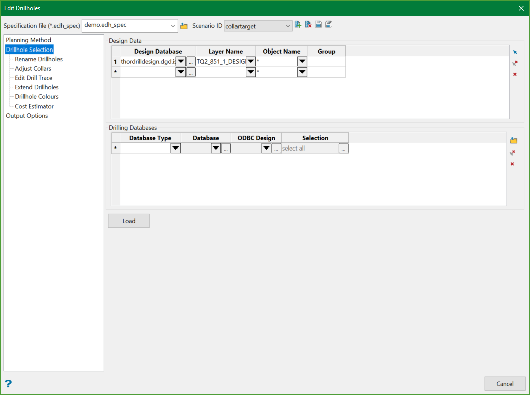 This is the desired design database from which the drillholes are to be selected. The drop-down list allows for the name to be typed, picked from available databases in the current project directory, or selected from alternative folder locations using the Browse button.
