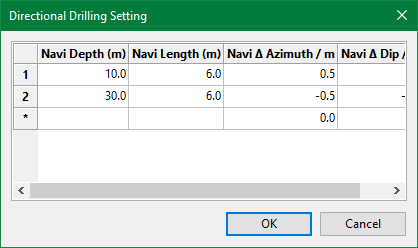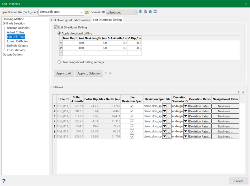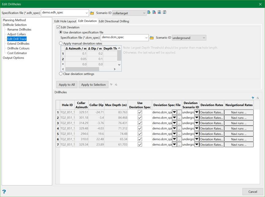 When drilling, sometimes localised sections of the drillhole are required to be drilled using navigational or directional drilling methods in order to control the orientation of the drillhole and steer it towards the desired target. In order to account for this directional drilling, localised deviation rates can be applied to all drillholes using the Apply to All button or those currently selected in the Grid by using the Apply to Selection button.