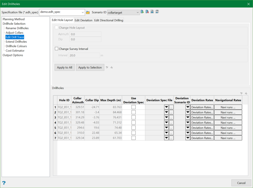 This section allows the trace of the planned drillholes to be updated to accommodate desired changes to Hole Layout, Survey Intervals, Deviation Rates, and Directional drilling.
